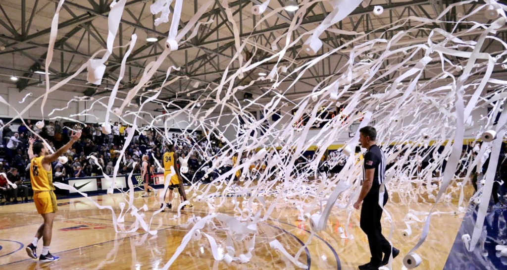 Since the 1970’s the William Penn Statesmen have had a tradition on one special home game of throwing toliet paper rolls onto the court after the Statesmen score their first basket of the game.