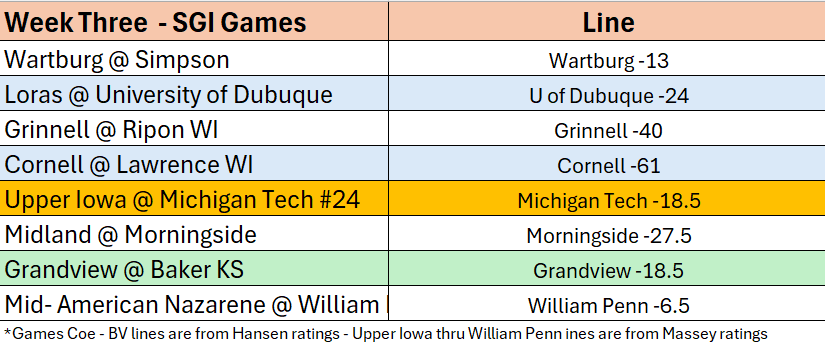 The lines we are using come from two great sites Massey Ratings for NAIA and D2 games and Hansen Ratings for DIII games. So, a big thank you to both those great sites and teams for the work they do to promote NAIA, DII, FCS and DIII Football.
