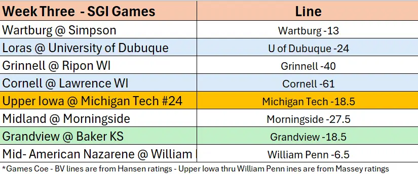 The lines we are using come from two great sites Massey Ratings for NAIA and D2 games and Hansen Ratings for DIII games. So, a big thank you to both those great sites and teams for the work they do to promote NAIA, DII, FCS and DIII Football.