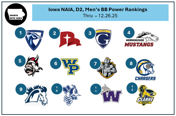 Grand View 9-5, William Penn 9-4, and Dordt 9-6 are off to strong starts. Briar Cliff is 7-6, Mount Mercy is 7-7, St. Ambrose 4-8, Waldorf 4-10, and Clarke 3-11 round out our first set of rankings for the 25-26 season.