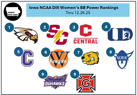 Our first SGI Women’s Basketball Power Rankings for the basketball season are out. In Division 3, we have 10 Colleges in the state – Buena Vista, Central, Coe, Cornell, Dubuque, Grinnell, Loras, Luther, Simpson, and Wartburg that we cover.